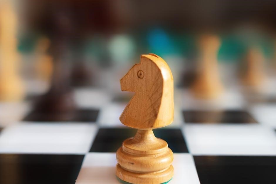Chess moves chart PDFs clearly illustrate the knight’s unique “L-shape” movement, showcasing its ability to jump over other pieces—a distinctive trait.